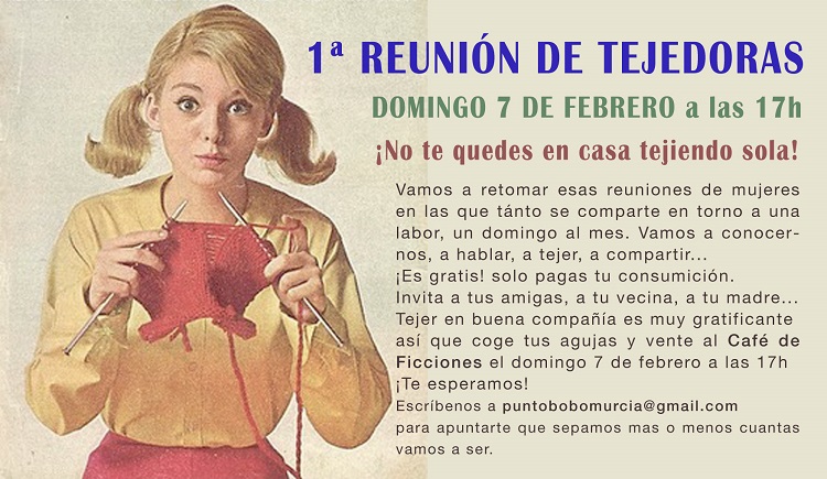 Con la intención de retomar las antiguas reuniones en las que se hablaba y compartía experiencias en torno a unos ovillos de lana y unas agujas de tejer, Punto Bobo está organizando para este sábado 7 de febrero, a las 17:00 horas, la 1ª Reunión de Tejedoras en el Café Ficciones de Murcia.