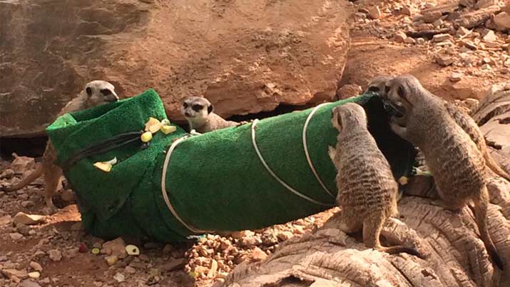 "A los leones, por ejemplo, se les ha escondido su comida camuflada con plumas en objetos como cajas de cartón o sacos de arpillera. Las suricatas disfrutan mucho con las tuberías, en las que le escondemos su alimento favorito: los gusanos. Además, para nuestra nutria hembra más joven hemos creado una balsa con boyas, en la que todavía no se atreve a meterse, pero le despierta mucho la curiosidad".