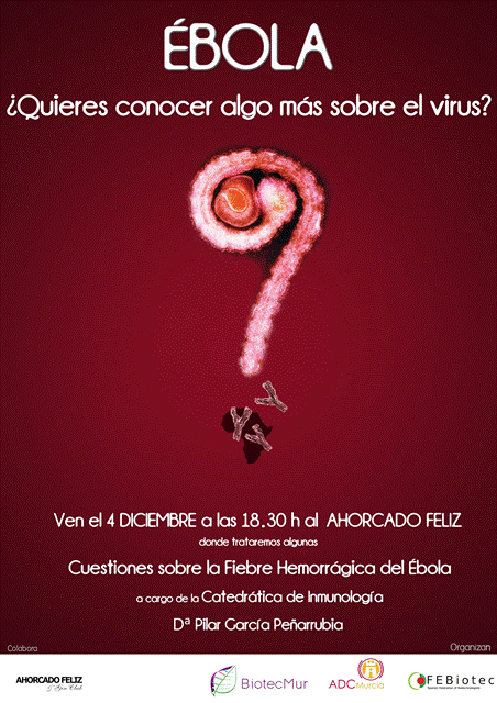 BiotecMur, en colaboración con la Asociación de Divulgación Científica de la Región de Murcia (ADCMurcia) y la Federación Española de Biotecnólogos (FEBiotec) te traen la conferencia “Cuestiones sobre la Fiebre Hemorrágica del Ébola“ Donde la doctora Pilar García Peñarrubia, catedrática en inmunología de la Universidad de Murcia, te explicará las características del virus y todo lo relacionado con su virulencia y afecciones a humanos.