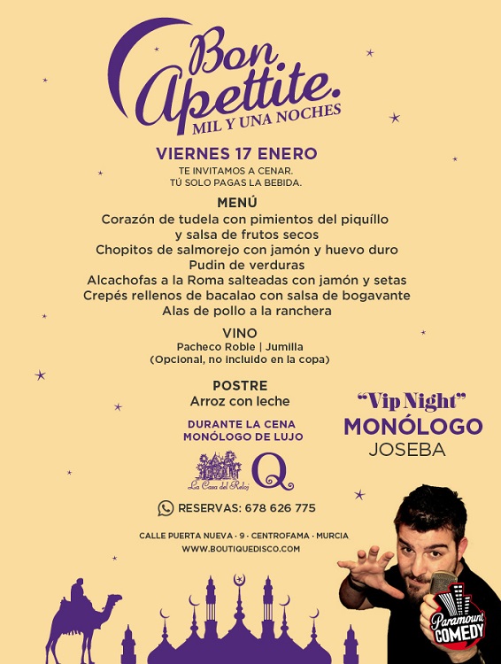 Este viernes 17 de enero, se celebrará otra cena Bon Apettite a la Discoteca Boutique. Pagando sólo la bebida, Boutique te invita a una cena de nivel con el siguiente menú: