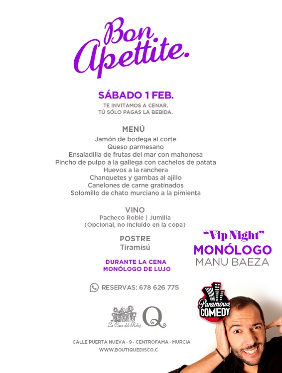 Además, durante la cena podrás disfrutar del monólogo de Manu Baeza, monologuista de Paramount Comedy.