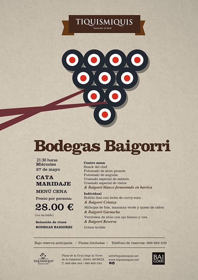 Este Miércoles 27 de Mayo a las 21:30, tenemos una cita con la gastronomia en "Tiquismiquis Gastrobar & Sushi", donde podremos hacer una cata maridaje de las Bodegas Baigorri.