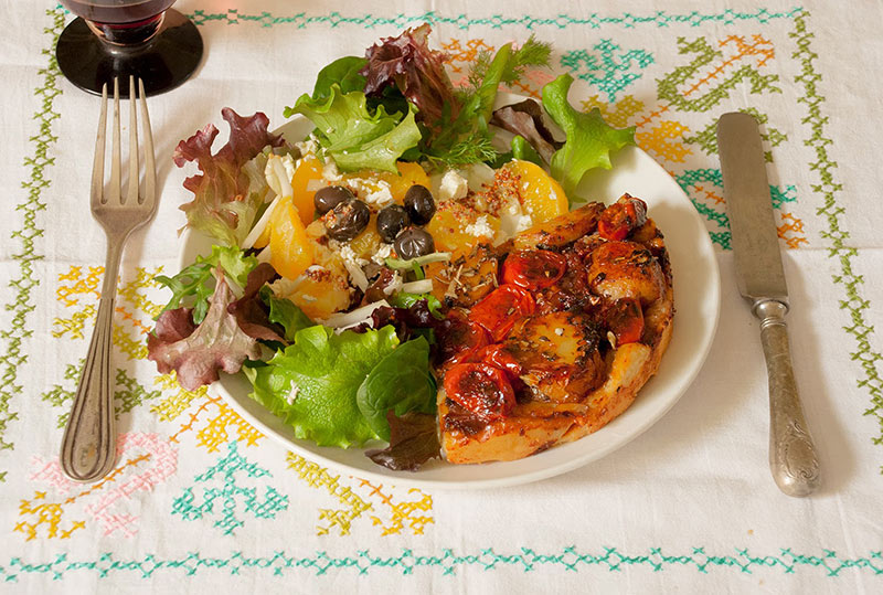 - Tarta tatín de patatas y tomates caramelizados con queso de cabra