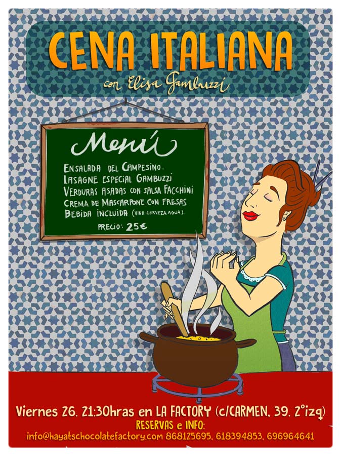 Este viernes 26 de Junio tendremos una cena especial Italiana de manos de la encantadora Elisa Gambuzzi. El ambiente será íntimo y el aforo limitado. El lugar elegido es La Factory (C/ Carmen 39, 2º izq, Cartagena)