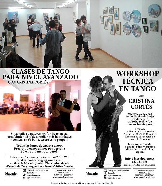 Debido a la pasión que tiene la gente por el tango en Murcia y a ir a aprender y a bailarlo con Cristina Cortés, en la Galería Léucade han decidido abrir un nuevo grupo los lunes para alumnos/as con nivel avanzado.