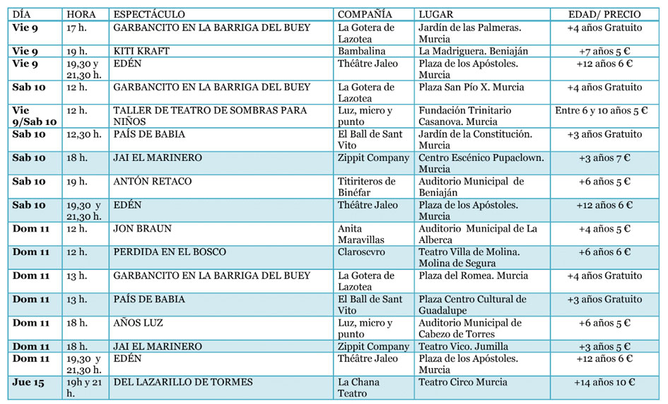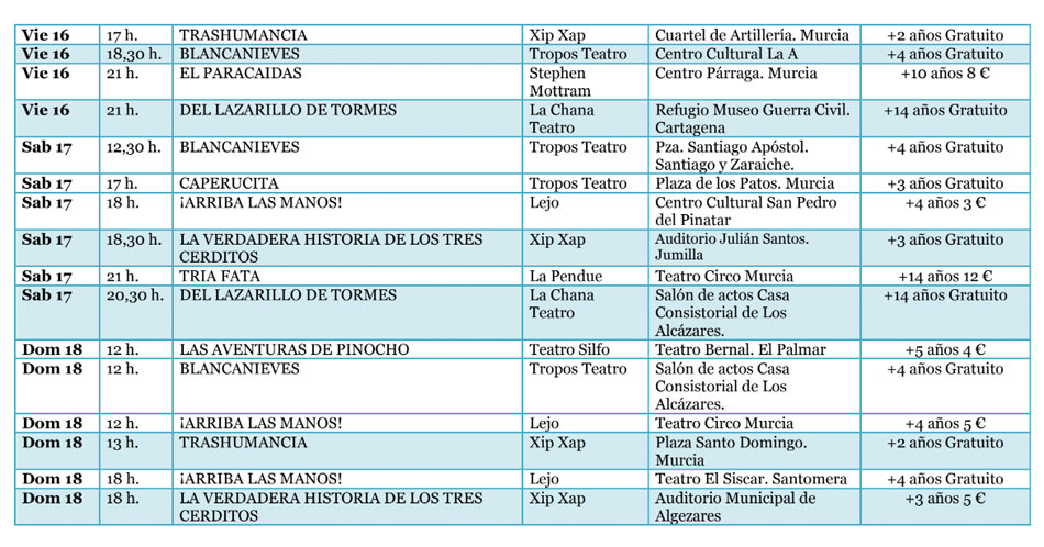 Los espectáculos duran 10 días y se dan en 28 espacios diferentes por todo el territorio de la Región de Murcia, por lo que se diversifica y acerca a todos los públicos, desde familias, colegios e incluso adultos.