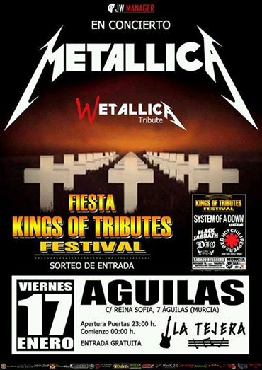 El grupo Wetallica, banda tributo a Metallica, tocará el próximo viernes 17 de enero en la Sala La Tejera (Calle Reina Sofía, 7) de Águilas. El concierto tendrá lugar a partir de las 00:00 horas, y será gratuito.