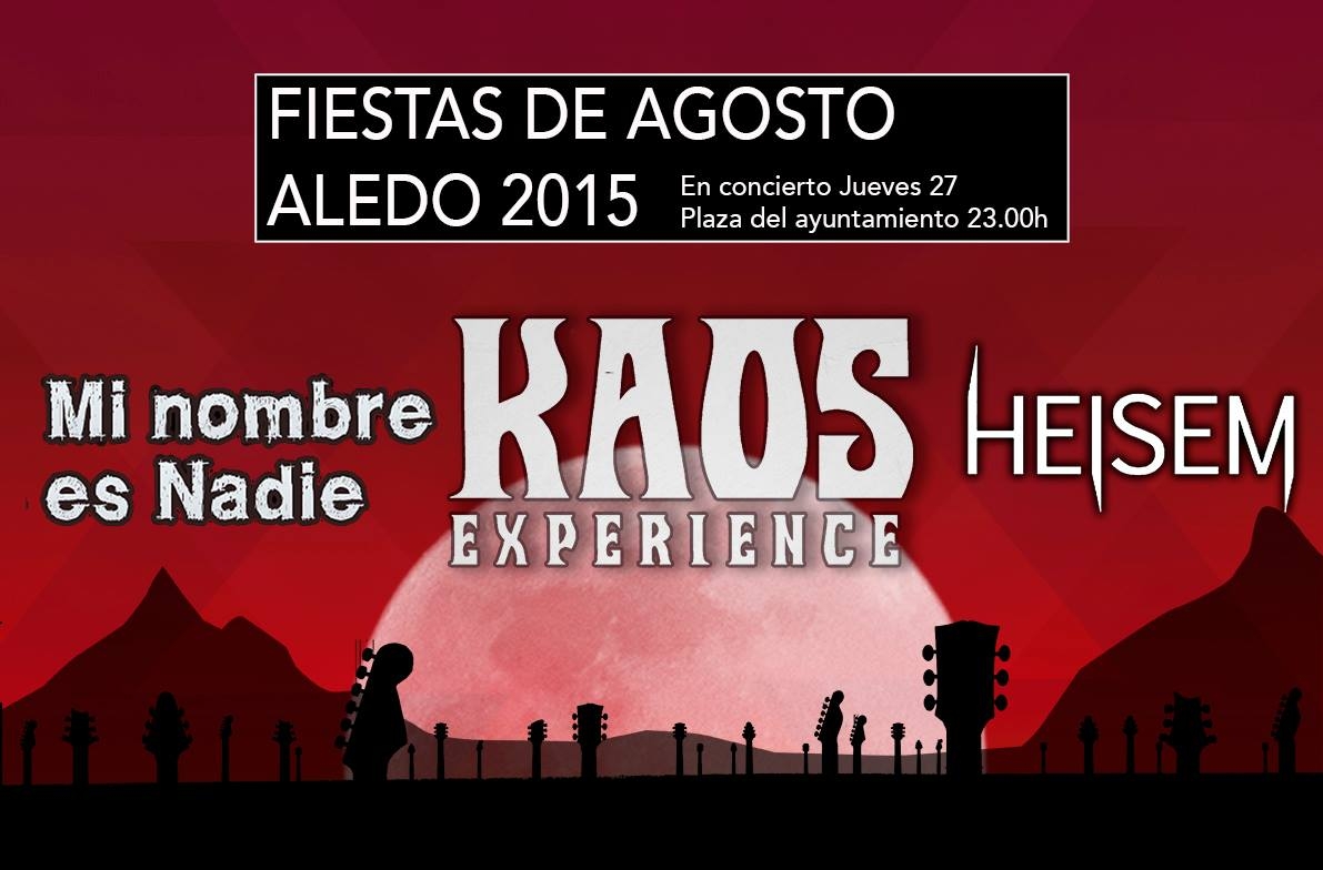 Un año mas el Ayto. de Aledo apuesta por el Rock en sus fiestas, sobre el escenario las bandas: KAOS experience,que sigue presentando su Ep 2015,Heisem oficial con su punk-rock caracteristico, y Mi Nombre Es Nadie, que debutan con un nuevo proyecto,algunos de los miembros de la desaparecida Banda J´aleo,ya sabeis, no podeis faltar,estaremos en el escenario principal, el epicentro de la fiestas!!!Viva Aledo, vivan sus fiestas!!!