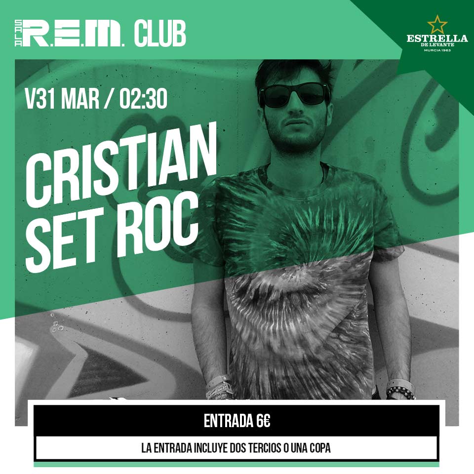 Cristian Set-Roc, posiblemente uno de los ilicitanos más conocidos en todo el Levante, se ha ganado a pulso la residencia en algunos de los mejores clubes de la zona. Bizz’art, Sala REM, Stereo, Murray Club y sobre todo, Confetti Pop Club cuentan con él como un valor seguro para las mejores noches. Y es que con él el espectáculo está garantizado. Fiesta, confetti, locura a gogo, shows donde todo puede pasar y diversión a raudales que no le impiden realizar cuidadas y precisas mezclas, en unas sesiones demoledoras donde los hits se suceden con frescura y soltura hasta dejarte el cuerpo exhausto de bailar y cantar. Let’s Roc!