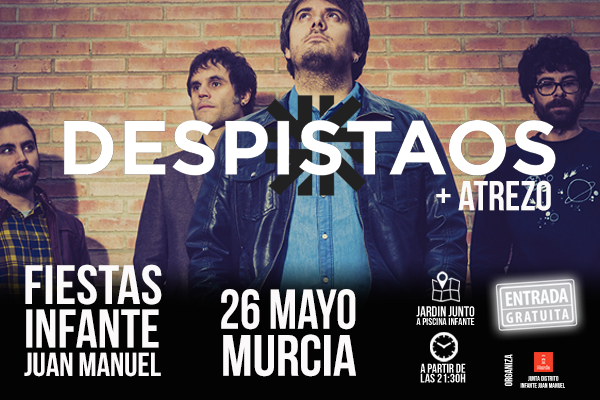 El viernes 26 de mayo a las 21:30 horas en la en la Piscina Infante Juan Manuel de Murcia concierto de Despistaos, banda de Guadalajara conocida en todo el país que ha cosechado grandes éxitos como “Física o Química”, “Cada dos minutos” o “Estoy aquí” y que ha vuelto a los escenarios con un enorme éxito de público en cada uno de sus conciertos. Estarán acompañados por los murcianos Atrezo, una de las bandas de la Región con más proyección.