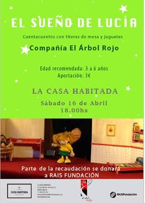 La Casa Habitada albergará el próximo sábado 16 de abril, a las 18:00 horas, "El Sueño de Lucía", cuentacuentos con títeres y juguetes. La obra, dirigida a niós/as de entre 3 y 6 años, será representada por la Compañía El Árbol Rojo.