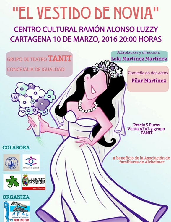 La Concejalía de Igualdad del Ayuntamiento de Cartagena y el Grupo de Teatro Tanit, pondrán en escena la obra "El Vestido de la Novia", con un fin benéfico, ayudar a la Asociación de familiares y enfermos de Alzheimer (AFAL).