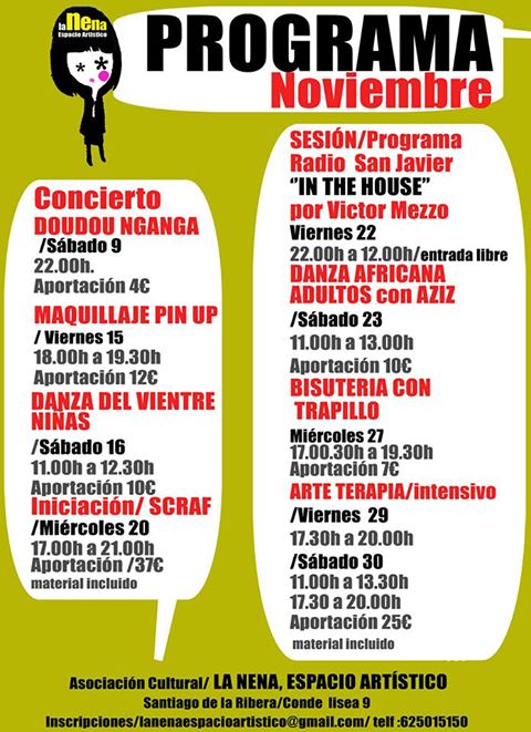 La Nena, Espacio Artístico, es una asociación cuyo objetivo es llevar a cabo actividades de diferentes disciplinas artísticae ( talleres fijos como microteatro, yoga, o guitarra española a talleres que varían mensualmente como, costura, esparto, fotografía, ilustración , etc...o espectáculos infantiles, conciertos acústicos o exposiciones de artistas noveles la mayoría...entre otras muchas actividades.