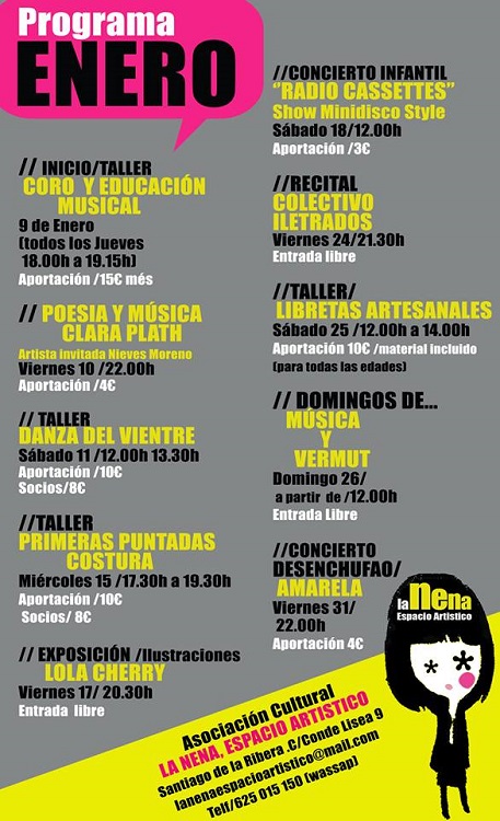La Nena, Espacio Artístico, es una asociación cuyo objetivo es llevar a cabo actividades de diferentes disciplinas artísticae ( talleres fijos como microteatro, yoga, o guitarra española a talleres que varían mensualmente como, costura, esparto, fotografía, ilustración , etc...o espectáculos infantiles, conciertos acústicos o exposiciones de artistas noveles la mayoría...entre otras muchas actividades.