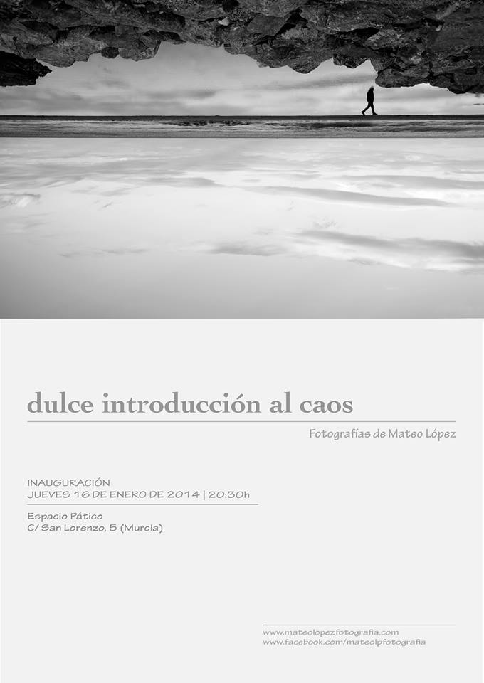 Una selección de fotografías del joven fotógrafo murciano, Mateo López, titulado "Dulce introducción al caos". Una mirada a unos espacios únicos y unos momentos captados con precisión y armonía. Donde la fuerza del blanco y negro es roto en ocasiones por elementos de color diseñados para complementar imágenes de gran sensibilidad y serenidad.
