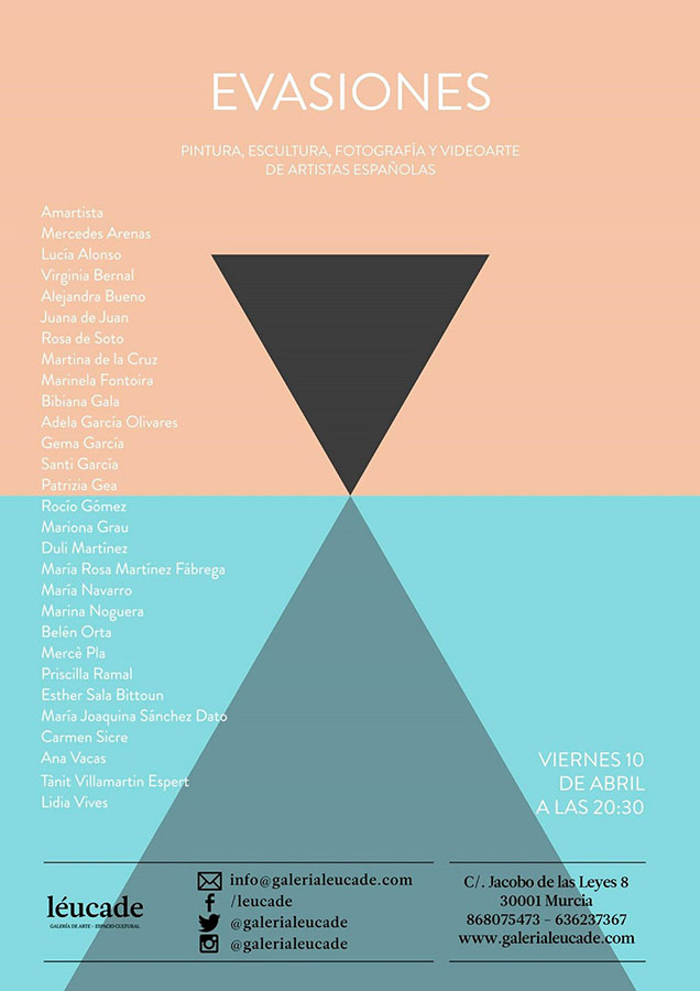 Galería Léucade se complace en invitarle este viernes 10 de abril a las 20:30 a la inauguración de la exposición colectiva "Evasiones", compuesta de pinturas, esculturas, fotografías y videoarte de mujeres de toda España. Estará expuesta hasta el 13 de mayo y ya hay programados diversos actos durante el tiempo de la exposición como presentaciones y firmas de libros, un concurso de fotografía con bicicleta, conciertos, proyecciones de películas, el club de lectura, etc.