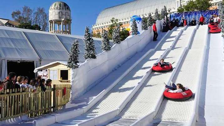 Los grandes atractivos que esperan a las familias son una pista de patinaje sobre hielo de 500 metros cuadrados, una montaña de 45 metros de descenso de trineos neumáticos y un tren infantil.