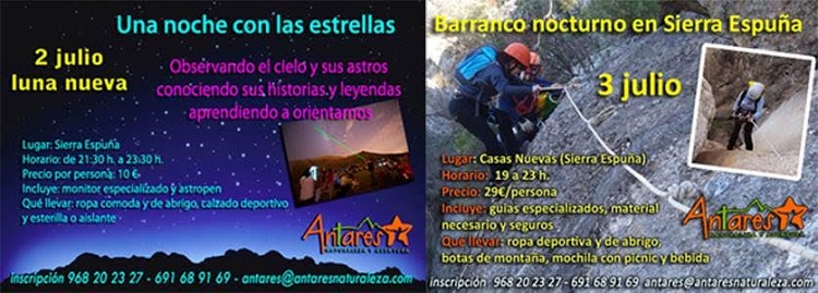 La observación tiene un precio de 10 € y el descenso de barranco 29 €. Para resevar, puede enviar un email a antares@antaresnaturaleza.com o llamar a los teléfonos 968202327 o 691689169.