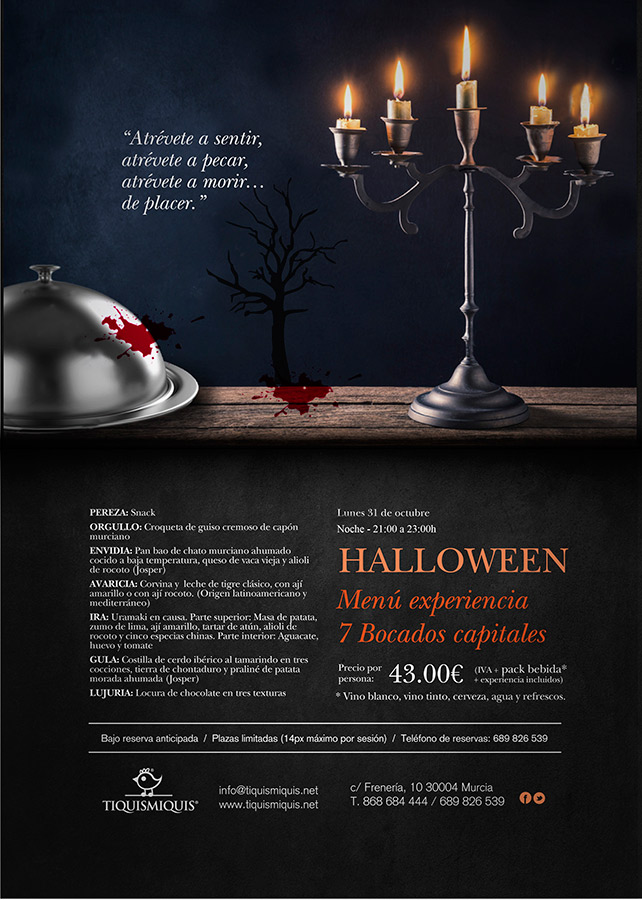 Un Halloween como jamás han vivido en Tiquismiquis. Hoy Lunes 31, podreis disfrutar de una cena temática en Tiquismiquis, Un menú especial, compuesto por los 7 bocados capitales, será el hilo de unión que marque el servicio. Los participantes deben descubrir al asesino del restaurante a través de una espeluznante historia acompañada de una gran puesta en escena.