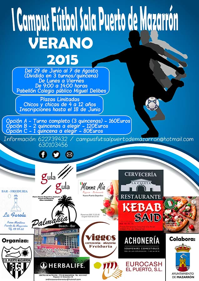 Este verano disfruta del deporte con el I Campus de Fútbol Sala que se desarrollará a partir del 29 de junio y hasta el 7 de agosto, divido en tres turnos por quincena. El horario será de lunes a viernes de 9 a 14 horas, en el pabellón del CEIP Miguel Delibes de Puerto de Mazarrón.