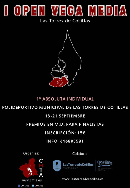 Ayer, sábado 13 de septiembre comenzó en Las Torres de Cotillas el “I Open de Tenis Vega Media”, que se disputará en categoría 1ª absoluta individual en las pistas del Polideportivo Municipal torreño. Organizado por el Circuito Murciano de Tenis Amateur (CMTA) en colaboración con la Concejalía de Deportes local, el torneo se alargará hasta el próximo domingo 21 septiembre y sus finalistas recibirán premios en material deportivo.