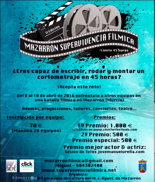 El II Certamen de Supervivencia Fílmica se completará con diversos actos que incluye la proyección de un documental, la actuación del grupo de teatro Canalejas con un homenaje a Cervantes (viernes 8 de abril, 20:00 horas) o la proyección de cortometrajes, charla con youtubers (sábado 9 de abril, a partir de las 17:00 horas) y concierto especial de bandas sonoras (domingo 10 de abril, a partir de 17:00 horas). Todas las actividades complementarias se desarrollarán en el Centro Cultural de Mazarrón.