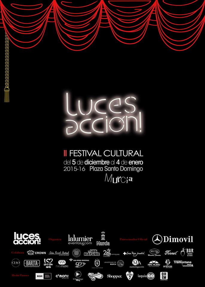 Luces, Acción! también es una plataforma que aporta un nuevo tejido cultural a la ciudad, invitando a participar a artistas, músicos y empresas, de ámbito internacional, con el fin de ofrecer una rica agenda de actividades culturales, impregnando de creatividad e interés a la ciudad de Murcia.