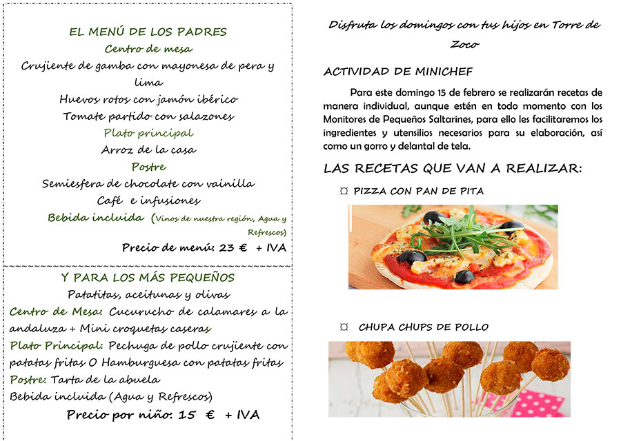 Pasa un día diferente en la Torre de Zoco, por la mañana los más peques harán el taller de cocina, más tarde habrá un menú especial para grandes y mayores y por la tarde los peques tendrán hichables, karaokes, teatro...
