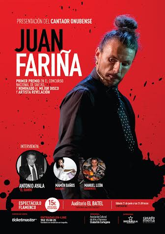 Juan Fariña es un cantaor que, siendo un conocedor de los cantes andaluces, ha demostrado un especial interés por los cantes de la sierra minera de Cartagena y la Unión, prestando una atención especial por las tarantas, las cartageneras y el fandango minero. Recientemente nominado al mejor disco y artista revelación del año 2013 con su primer trabajo, “Roete”. Además también ha sido el ganador del Concurso Nacional de Saetas de Cartagena.