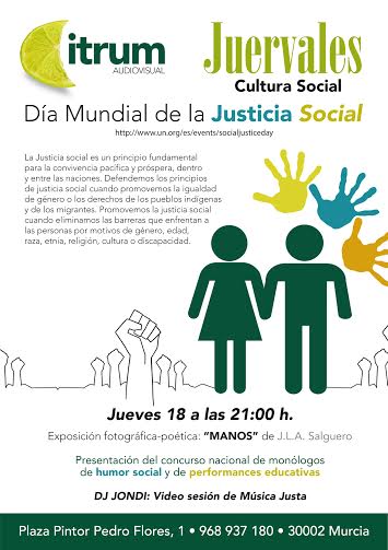 En esta ocasión, para hoy jueves 18 de febrero Día Mundial de la Justicia Social, Citrum nos propone visitar la exposición fotográfica-poética "Manos" de J.L.A. Salguero a partir de las 21:00 horas. Además, hoy se presentará el Concurso Nacional de Monólogos de humor social y performances educativas: "En clave cítrica".