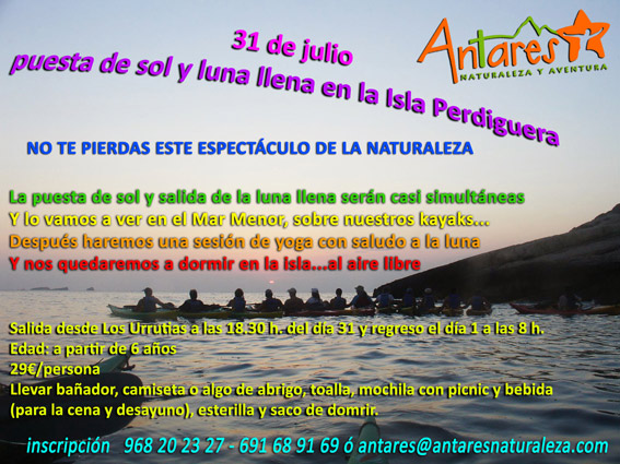 Practica Kayak de una forma como nunca lo habías hecho con Antares Naturaleza y Aventura. Podrás dar un paseo y ver la puesta de sol junto con la Luna llena en la Isla Perdiguera.