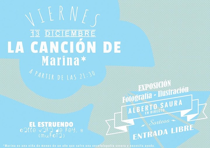 Marina es una niña de menos de un año que sufre una encefalopatía severa y para ayudarla hemos creado una fiesta con música en directo (Alberto Saura), exposición, venta y sorteo de obra artística (fotografía e ilustración), además de otras sorpresas. ¡No te lo pierdas!