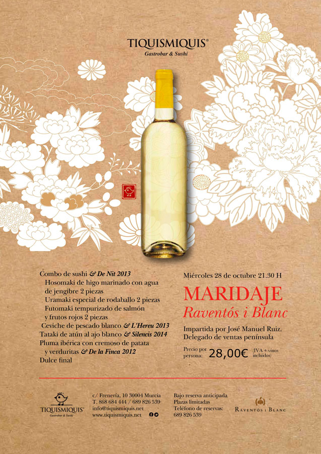 Nueva cata Maridaje en Tiquismiquis Gastrobar & Sushi. Esta vez el protagonista es el vino Raventós y Blanc. Si quieres degustarlo ven y disfrútalo este Miércoles 28 de Octubre.