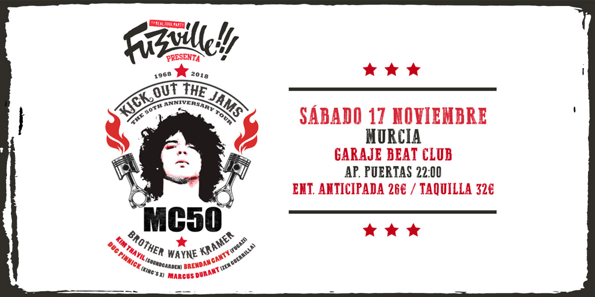 La gira del 50 aniversario de los seminales MC5 (bajo el nombre MC50) pasará por Murcia de la mano de Fuzzville!!!. Con una alineación de lujo capitaneada por su guitarrista original, Wayne Kramer, y que incluye a miembros de Soundgarden, Fugazi o King's X, la banda repasará los temas de su corta pero trascendental carrera como una de las bandas que, en los 60, más contribuyeron a asentar los pilares de lo que acabaría siendo el sonido punk y hard-rock.