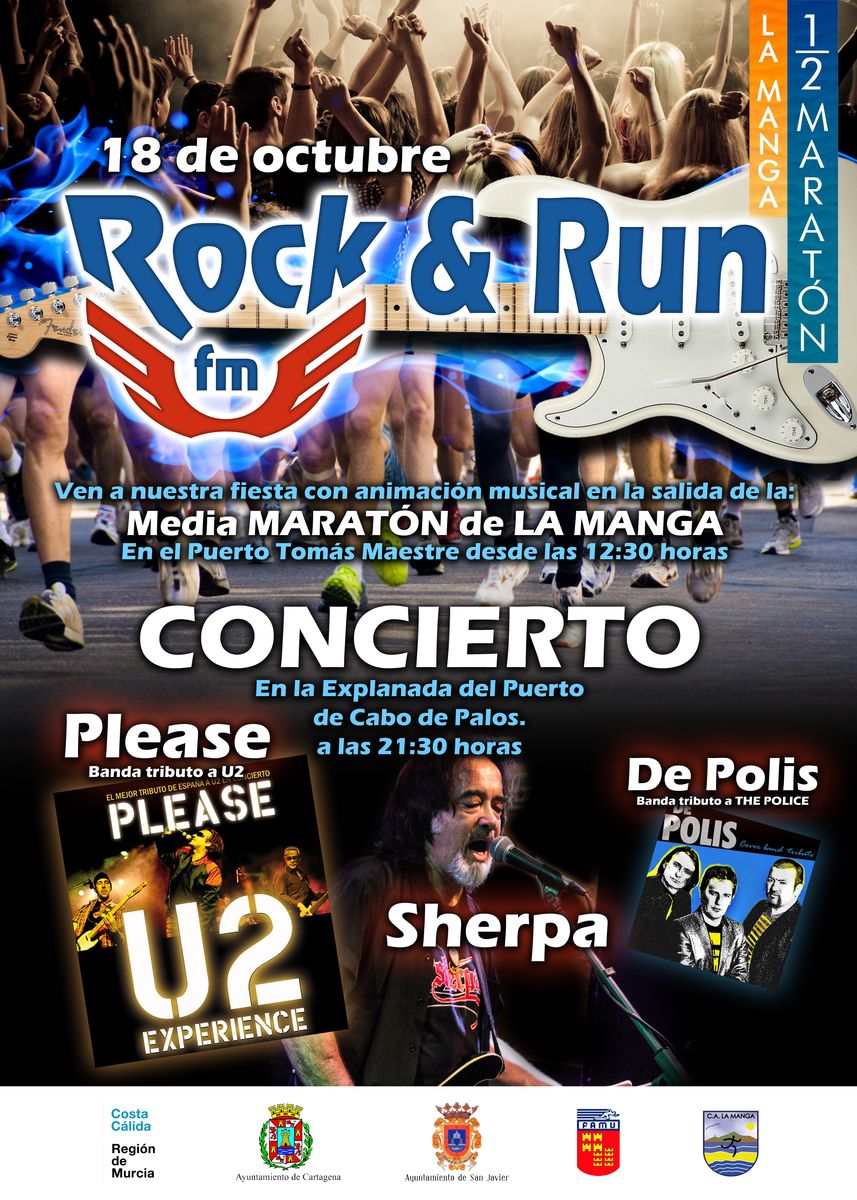 El Rock & Run contará con las actuaciones de las bandas tributo a U2 y The Police, Please y De Polis, junto a Sherpa. La actuación musical se organiza con motivo de la primera edición de la Media Maratón de La Manga, que se llevará a cabo ese mismo día.