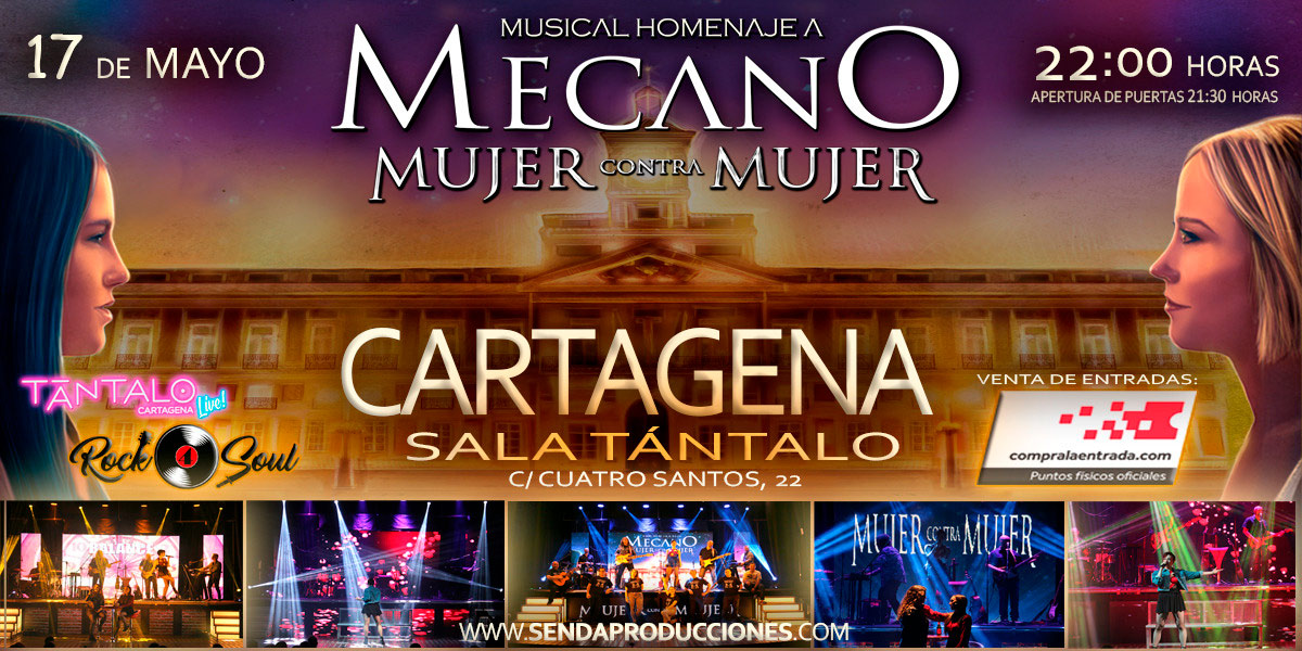 Mujer contra mujer en Cartagena_ "Mujer contra Mujer", musical homenaje a Mecano en Sala Tántalo de Cartagena el 17 de Mayo. Sonido en directo con el máximo cariño y respeto a los Hermanos Cano. ENTRADAS Entrada anticipada: 10€ (+ gastos)Entradas en taquilla: 12€ HORARIO Hora de apertura: 21.30 horas.Hora de comienzo: 22.00 horas.