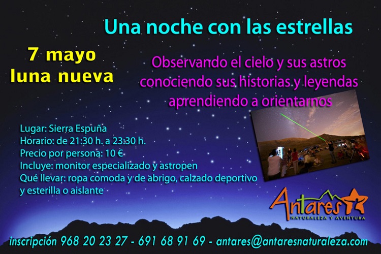 Antares, Naturaleza y Aventura, han organizado para el próximo sábado 7 de mayo una observación al cielo guiada en Sierra Espuña.