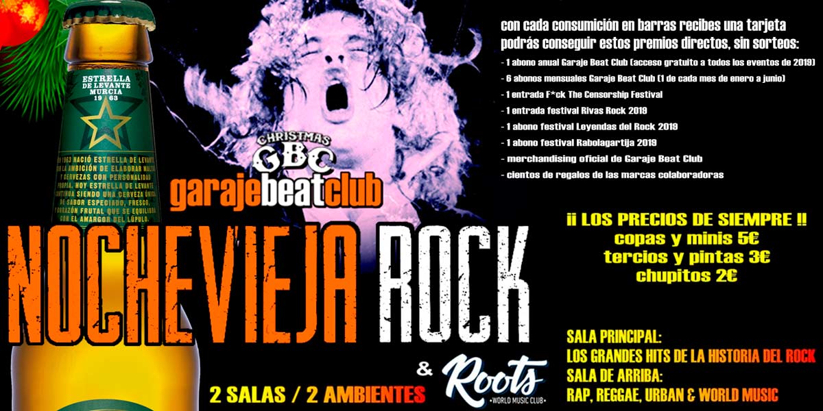 Vive una Nochevieja inolvidable con la mejor música rock y la mejor música urbana desde el primer minuto de 2019 en dos ambientes diferentes. En la sala de abajo sonarán los grandes hits de la historia del rock internacional con el mejor sonido de Murcia. En la sala de arriba sonará el mejor rap, reggae, dancehall, trap y world music. La Nochevieja que siempre has soñado, con precios muy ajustados en barras, copas y minis a 5 euros, pintas y tercios a 3 euros y chupitos a 2 euros. Con cada consumición en barras se te entregará una tarjeta con la que podrás obtener montones de premios directos, un abono anual para entrar gratis a todos los eventos de Garaje Beat Club durante el año 2019, seis abonos mensuales de enero a junio, entradas para los festivales Leyendas del Rock, Rabolagartija, Rivas Rock y F*ck The Censorship, merchandising oficial de Garaje Beat Club, y cientos de regalos de nuestras marcas colaboradoras. Empieza el año de la mejor manera en Garaje Beat Club, con el mejor ambiente y con tu música favorita.