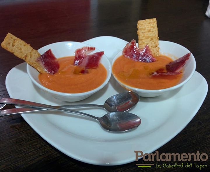 El parlamentario es un bocadillo con pan casero (del de antes,que se mantiene crujiente por fuera y tierno a la vez;no olvidemos que la elección del pan es fundamental en todo buen bocadillo), jamón ibérico, tocino ibérico y virutas de chorizo picante, un poquito de aceite y tomate. Tradicional,sencillo,pero buenísimo.Se presenta cortado en seis trozos de bocado para compartir y así seguir respetando su idea original de compañerismo en la mesa.Tal vez sea el mejor bocadillo de jamón que hayas probado JAMÁS,y eso,viniendo de mí,es mucho.