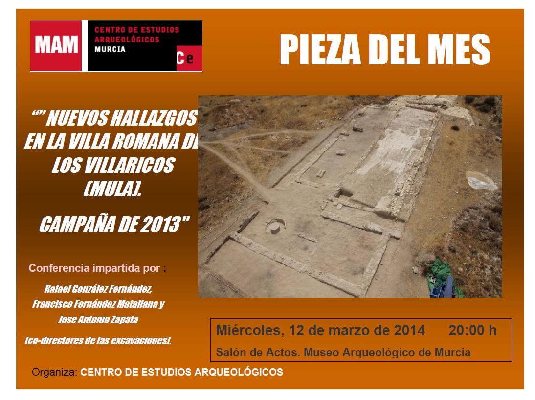 El Museo Arqueológico de Murcia (MAM), dentro de su ciclo de actividades, dedica la “Pieza del Mes” de marzo a la villa romana de Los Villaricos (Mula). Durante un mes, en la zona de entrada del Museo se expondrán en una de sus vitrinas las piezas halladas durante las últimas excavaciones realizadas en la villa romana. La actividad comienza el día 12 de marzo a las 20 h. en el salón de actos del MAM, con una conferencia a cargo de los directores de la excavación arqueológica, D. Rafael Gónzalez Fernández, prof. de Historia Antigua de la Universidad de Murcia, D. Francisco Fernández Matallana, arqueólogo y Jose Antonio Zapata Parra, Arqueólogo Municipal de Mula, donde explicaran los últimos hallazgos realizados.