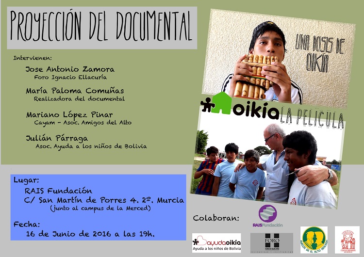 Tras la presentación de este video se dará paso a una breve exposición y comentario del trabajo social que realizan las ONG´s murcianas Amigos del Alto de Bolivia (Santa Cruz) y el Cayam-Cáritas (Murcia), actuando de anfitrión de esta proyección el Foro Ellacuría, que actuará de moderador del debate que surgirá tras las visualización del documental.