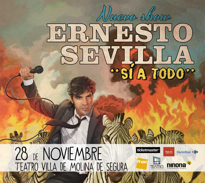 Por fin llega Ernesto Sevilla a la ciudad para presentar su nuevo espectáculo, Sí a todo , con nuevos monólogos y todo su humor absurdo. Después de presentarse por todos los teatros y salas del territorio nacional con Despedida Coconut, el talentoso humorista de la troupe chanante desembarca en Molina de Segura para conmemorar el IX Aniversario del Teatro Villa de Molina de Segura, con nuevo material y las mismas ganas de liarla de siempre.