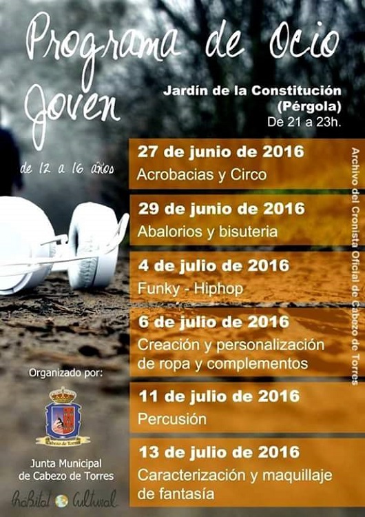 El municipio de Cabezo de Torres nos presenta su "Programa de Ocio Joven" destinado a jóvenes de 12 a 16 años que se celebrará, los lunes y miércoles, del 27 de junio al 13 de julio de 2016, de 21 a 23 horas, en el Jardín de la Constitución de la localidad.