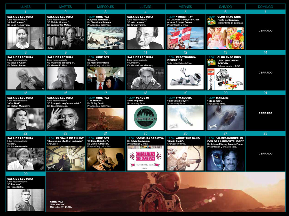 Ya tenemos las actividades para el mes de Febrero del Forum Fnac Nueva Condomina, llena de música, cine, literatura y talleres.