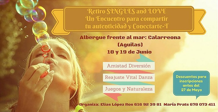El encuentro, organizado en el albergue de Calarreona (Águilas), a orillas del mar, pretende que los asistentes disfruten de dos días de diversión y descubrimiento personal. Si te apetece hacer nuevas amistades, necesitas un cambio en tu vida, saber cómo te encuentras en relación a tener pareja y te apetece ampliar tu círculo de gente y pasar un finde diferente y divertido, no dudes en apuntarte a el "Retiro Single and Love".