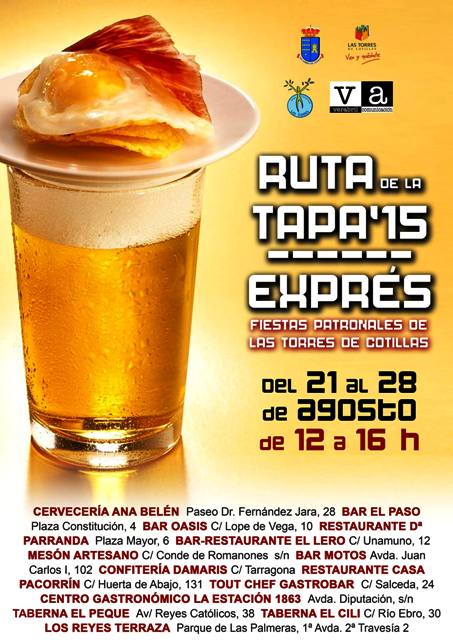 Desde este viernes 21 de Agosto y hasta el prximo viernes 28 del mismo mes, se celebrará a razon de las fiestas patronales de Las Torres de Cotillas, la V Ruta de la tapa Exprés, donde a precio de 2€ y con horario de 12 a 16 horas.
