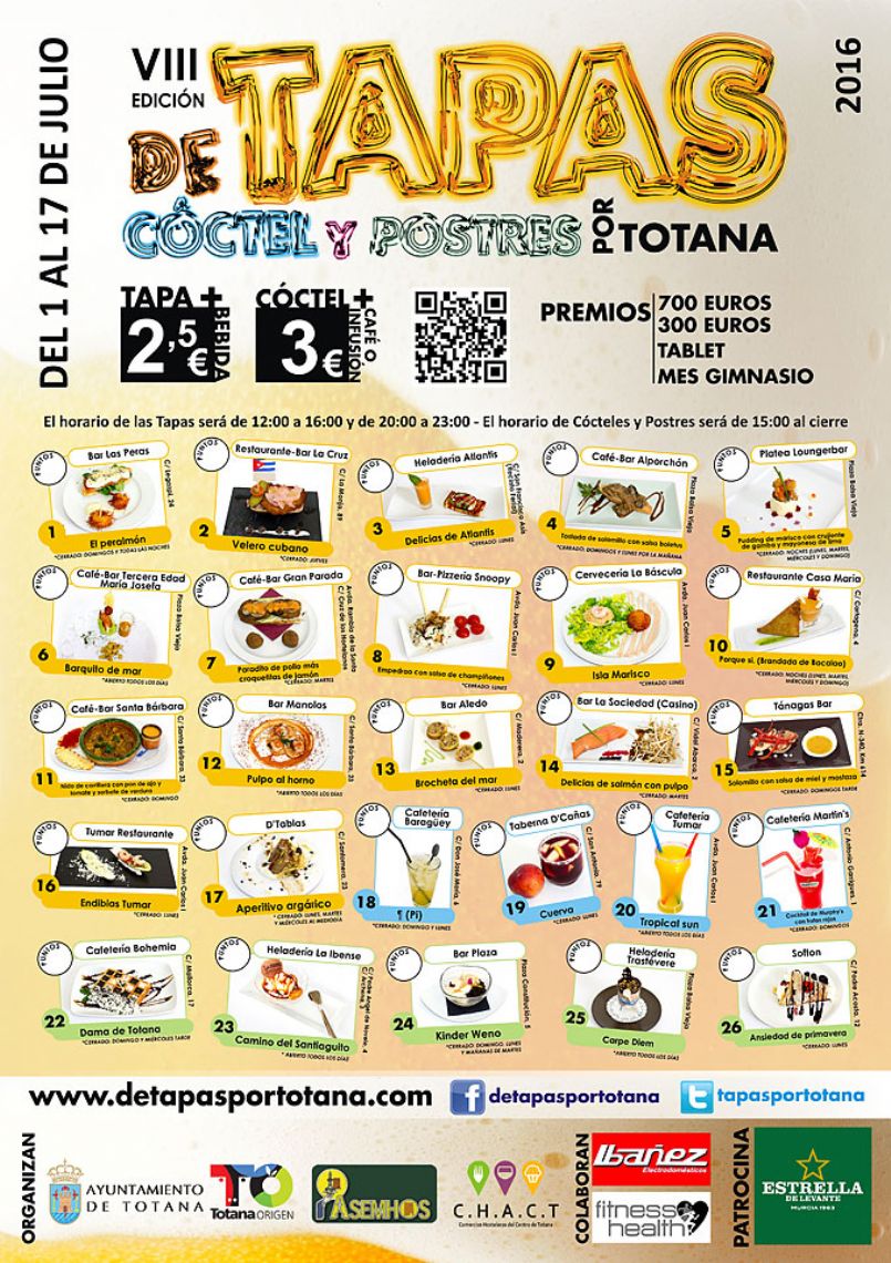 La "VIII Ruta de Tapas, Cóctel y Postres deTotana" se celebrará del 1 al 17 de julio, ambos inclusive, y contará con la participación de 26 establecimientos hosteleros de esta localidad, dentro del programa de fiestas patronales de Santiago´2016; así como con la entrega de premios para los participantes.