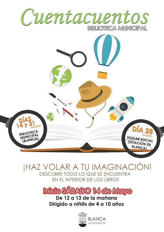Con el lema "Haz volar tu imaginación", el ciclo de Cuentacuentos comenzará este sábado 14 de mayo en la Biblioteca Municipal de Blanca. El resto de Cuentacuentos serán el 21 de mayo en el mismo lugar y el 28 en el Hogar Social de la Estación de Blanca.