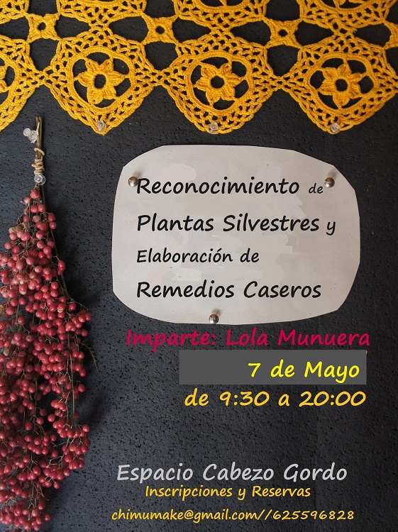 El próximo sábado 7 de mayo, Lola Munuera impartirá el "Taller de Plantas Silvestres y Elaboración de Remedios Caseros" en el Espacio Cabezo Gordo (Dolores de Pacheco).