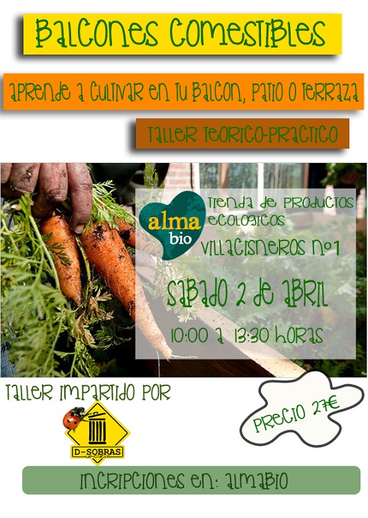Alma Bio (Calle Villacisneros, 1), tienda de productos ecológicos, nos ofrecen para el próximo sábado 2 de abril el taller "Balcones comestibles". En este taller teórico-práctico, nos enseñarán a cultivar distintos tipos de hortalizas en nuestro blacón o terraza de forma sencilla.